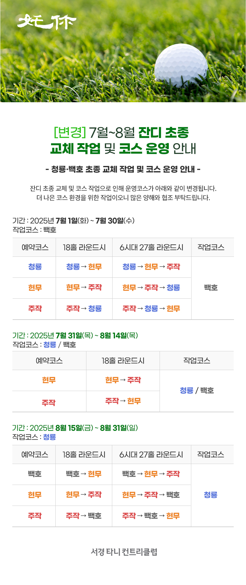 [변경]7월~8월 잔디 초종 교체 작업 및 코스 운영 안내